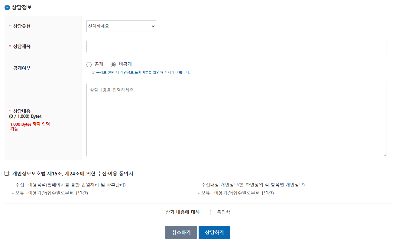 상담내용은 1,000Bytes 까지만 입력 가능해서 잘 정리해서 올려주세요