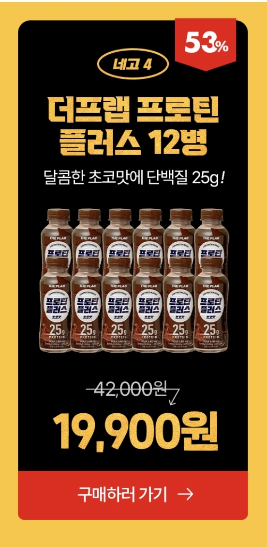 더프랩 프로틴 플러스 12병은 42,000원에서 53% 네고되어 19,900원 입니다