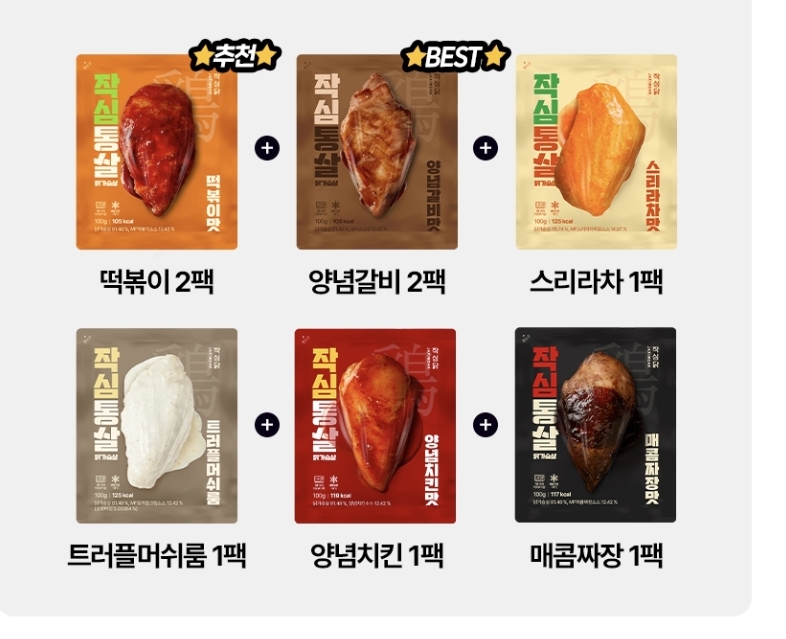 작심통살 닭가슴살 8팩 구성은 BEST 메뉴인 양념갈비 2팩, 추천메뉴인 떡볶이 2팩, 스리라차 1팩, 트러플머쉬룸 1팩, 양념치킨 1 팩, 매콤짜장 1팩 구성입니다