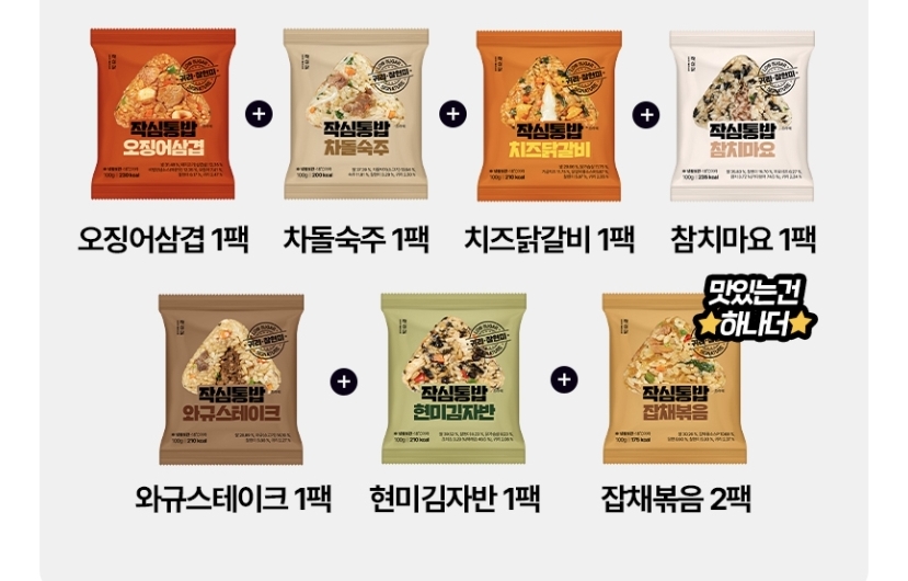 작심통밥 귀리주먹밥 8팩 구성은 오징어삼겹 1팩, 차돌숙주 1팩, 치즈닭갈비 1팩, 참치마요 1팩, 와규스테이크 1팩, 현미김자만 1팩, 잡채볶음 2팩 구성입니다