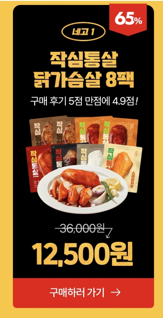 작심통살 닭가슴살 8팩이 36,000원에서 65% 네고되어 12,500원입니다