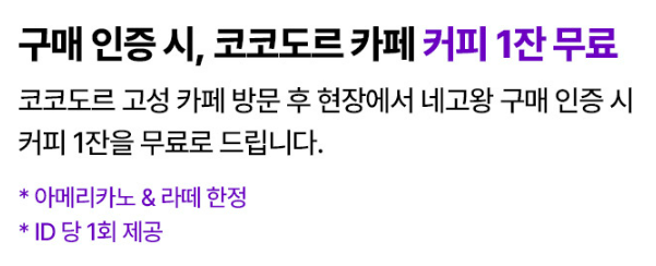 네고7 코코도르 고성 카페 방문 후 네고왕 구매 인증 하시면 커피 1잔 무료 증정 ( 아메리카노 / 라떼 중 택 1)
