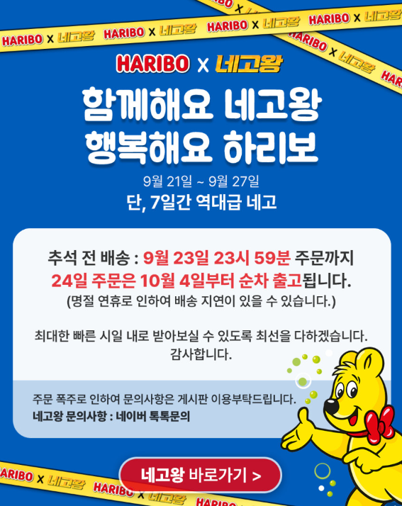 하리보 네고왕 이벤트 기간은 9월 21일부터 9월 27일까지 7일간입니다