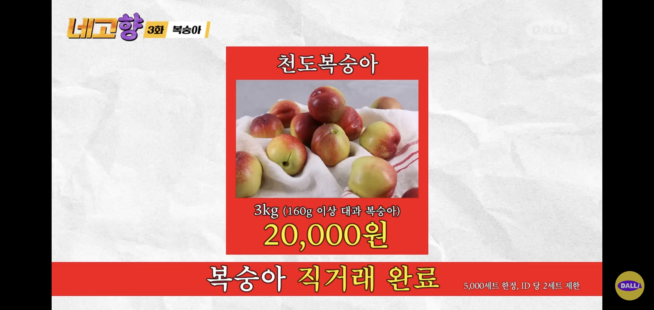 오늘 날짜 기준으로 천도복숭아 3kg (160g 이상 대과 복숭아)가 2만원으로 네고 됐어요