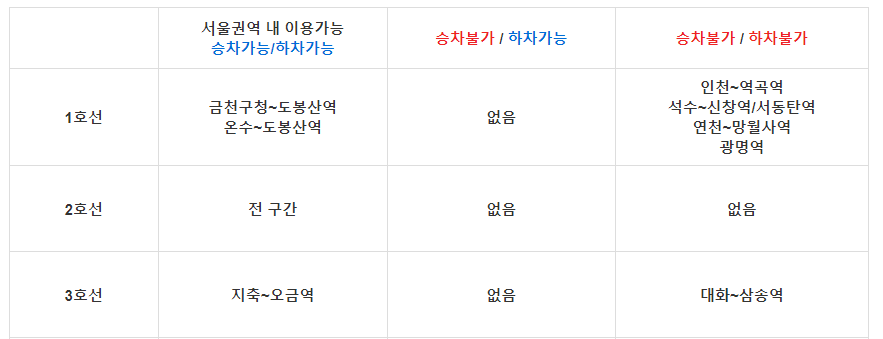 | 서울권역 내 이용가능 승차가능/하차가능 |