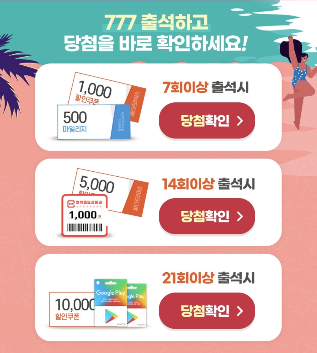 출석체크 밑에 777 추첨이벤트도 있는데 한 번도 된 적이 없어요..