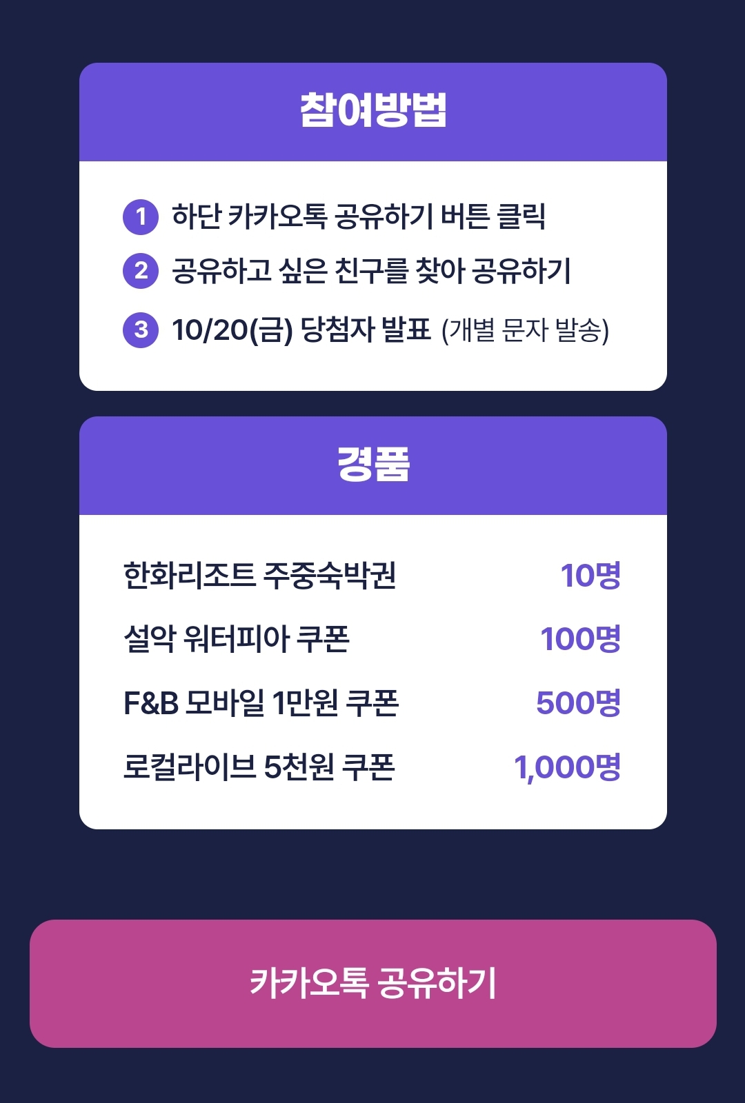 친구에게 한화리조트 숙박 세일페스타 카톡으로 공유하면 자동으로 이벤트가 응모됩니다