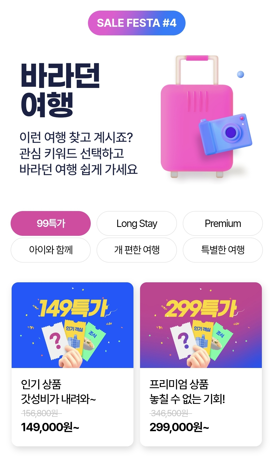 99특가, long stay, premium, 아이와 함께, 개 편한 여행, 특별한 여행 등 원하시는 테마 여행 상품 저렴한 가격에 이벤트 하고 있어요