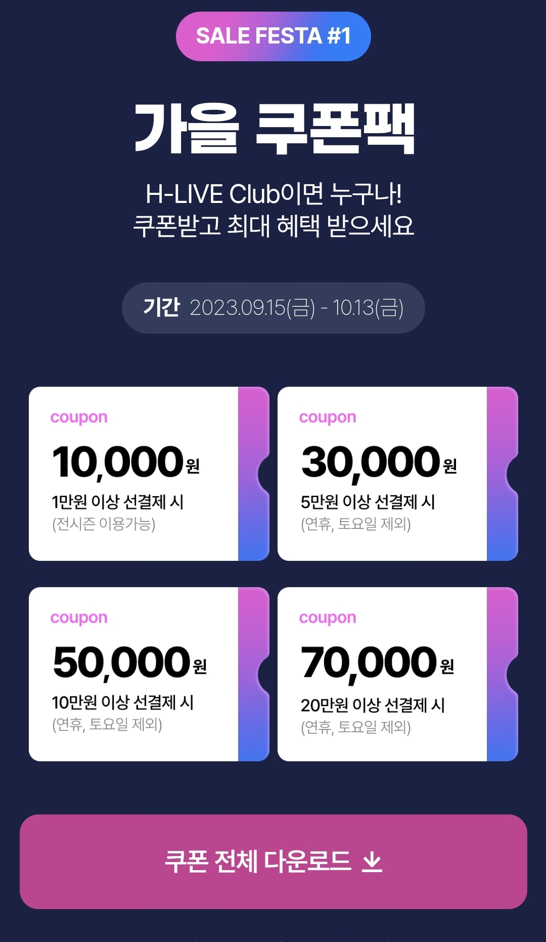 9/15~10/13 금요일까지 H-LIVE CLUB(한화리조트 회원) 이면 누구나 받으실 수 있는 가을 쿠폰팩이에요