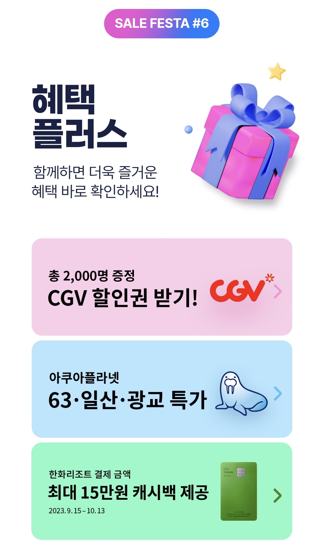 한화리조트 숙박 이벤트 외에도 CGV 할인권, 아쿠아플라넷 할인권, 카드 최대 15만원 캐시백 이벤트도 진행하고 있습니다