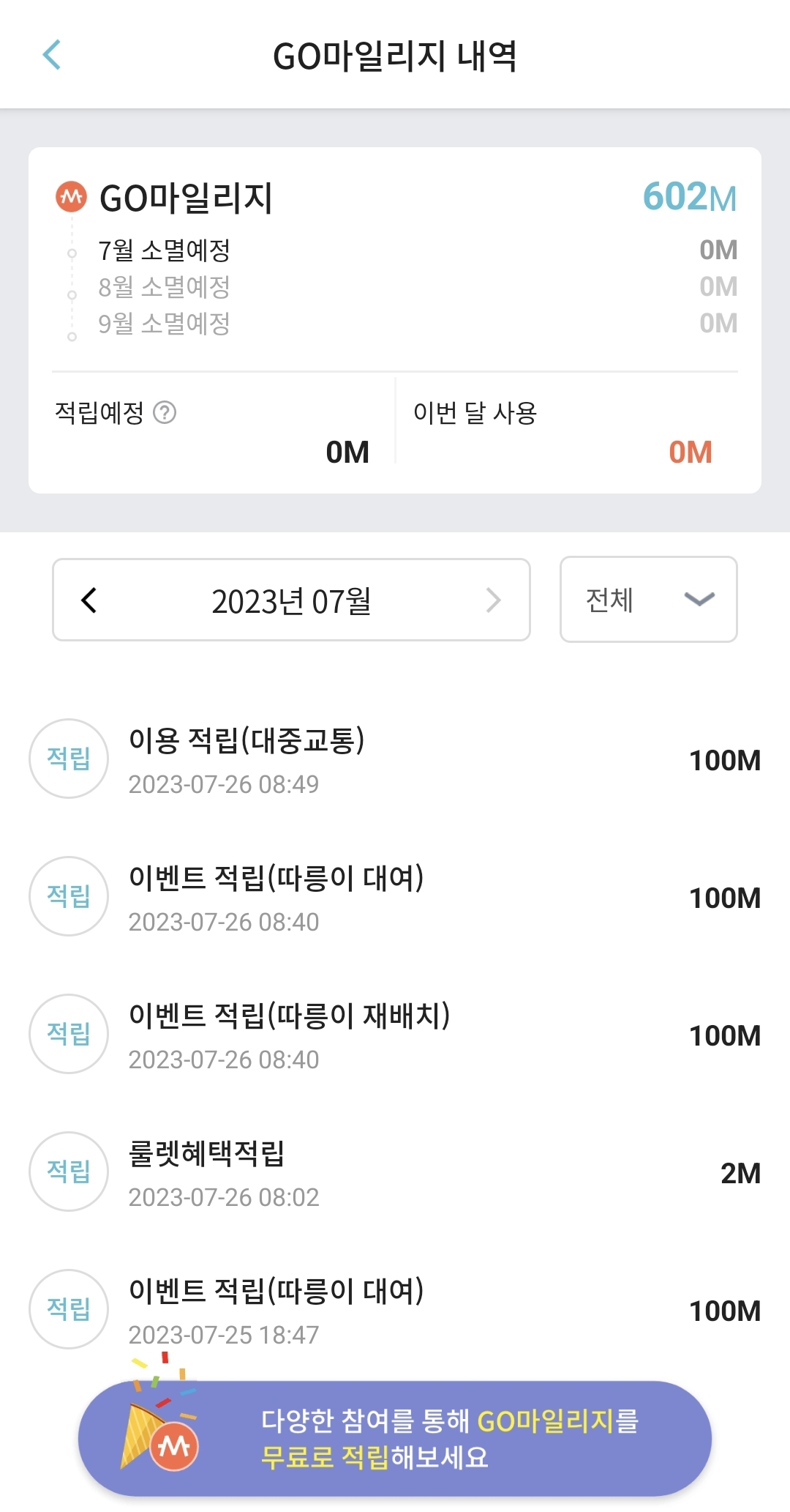 대중교통 리워드 첫번째 혜택으로 대중교통(버스, 지하철), 따릉이 이용하면 이틀 뒤 100M 자동적립되고 매월 최대 5000M 까지 적립 가능해요