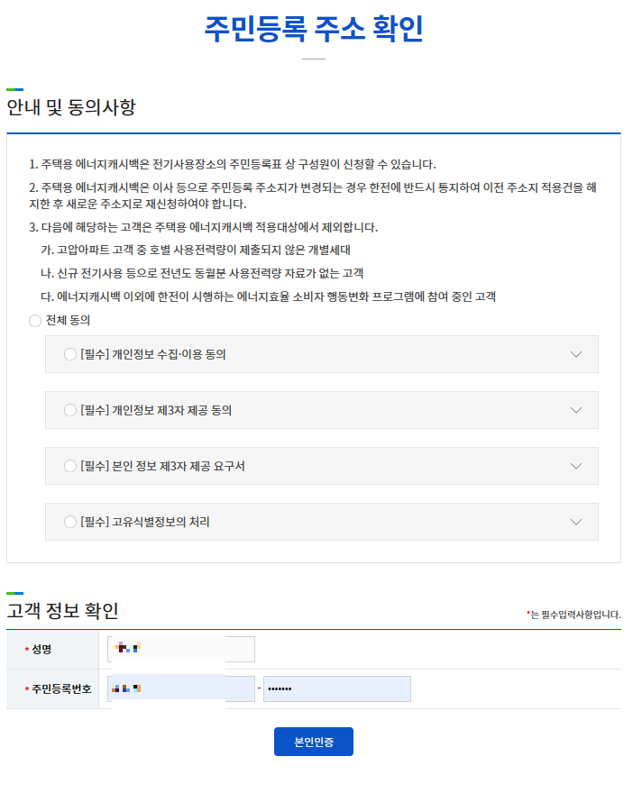 확인 및 동의사항 확인하고 체크 후 에너지캐시백 참여확인 버튼 눌러주세요