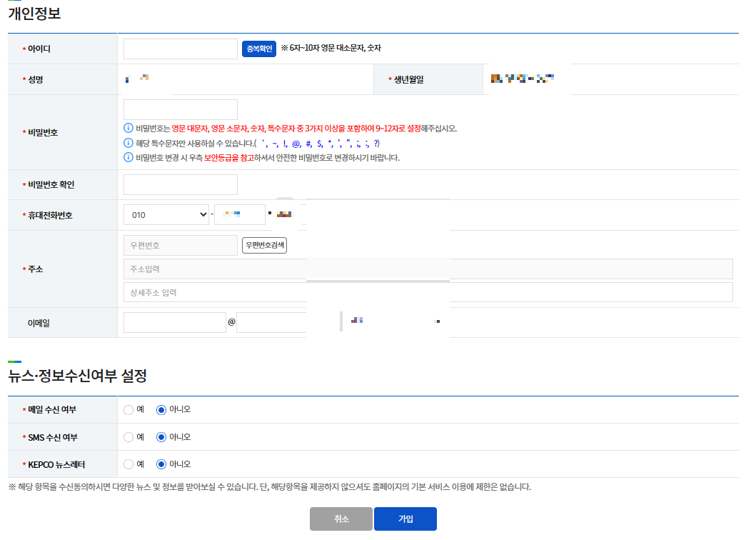 개인정보 입력과 뉴스,정보 수신여부 설정 체크 후 가입버튼 눌러주세요