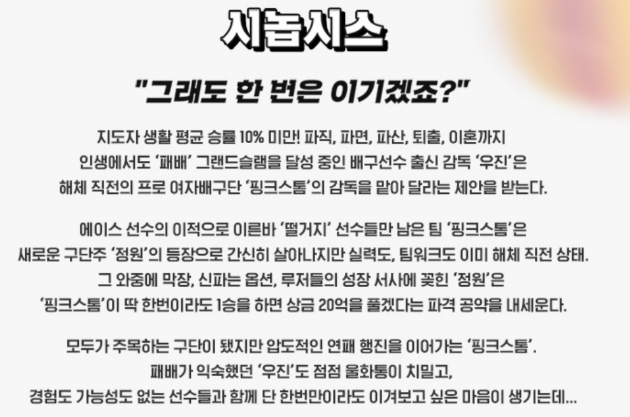 파직, 파면, 파산, 퇴출, 이혼까지 인생에서도 '패배' 그랜드슬램을 달성 중인 배구선수 출신 감독 '우진'은 해체 직전의 프로 여자배구단 '핑크스톰'의 감독을 맡아 달라는 제안을 받는다