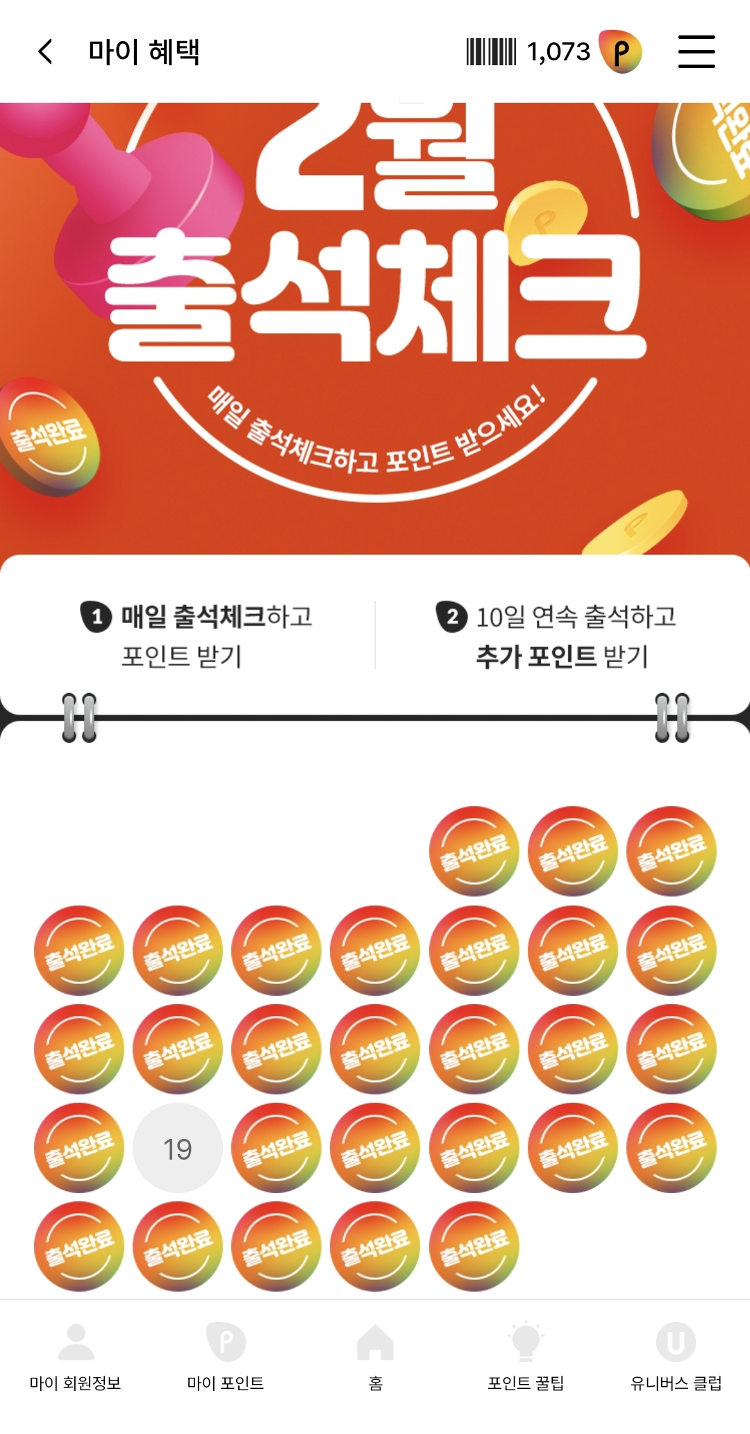 등급에 따라 출석체크 포인트 금액이 다르고 만근 적립금도 달라요