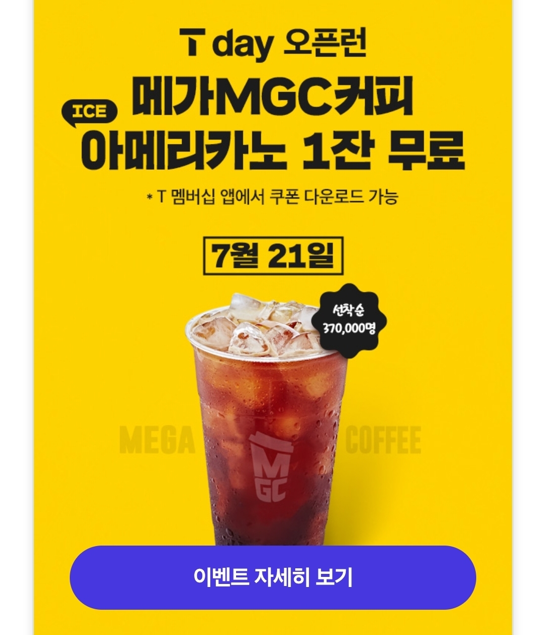 7월 21 오전 10시부터 선착순 370,000명에게 메가커피 아메리카노 1장 무료 증정 이벤트도 진행됩니다