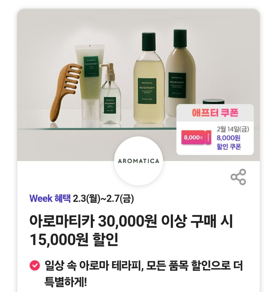 애프터쿠폰 - 15,000 원 ㅎ날인 쿠폰 사용 고객님께 애프터 쿠폰 추가 증정(2월 14일(금) 아로마티카 마이페이지 [쿠폰함] 자동발급
