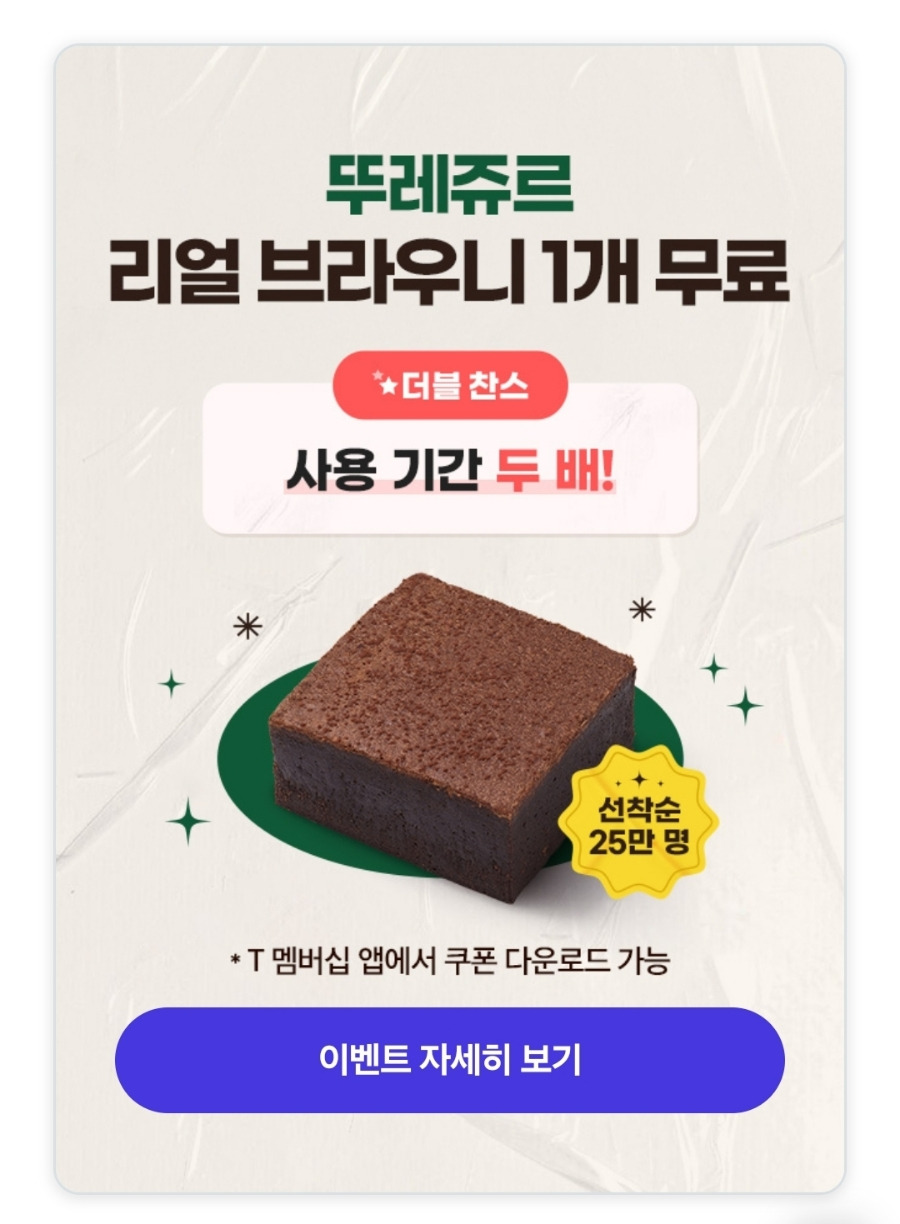이번 2월에도 뚜레쥬르 리얼 브라우니 1개 무료 선착순 쿠폰 이벤트 진행해요