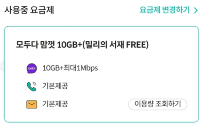 데이터 총 20GB + 전화 무제한 + 문자 무제한 + 밀리의 서재 공짜로 사용하는데