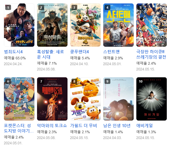 역시 범죄도시4가 1위이고 2위는 쿵푸팬더4 입니다