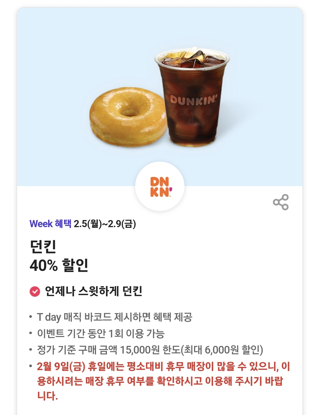 보통 첫째 주 티데이는 월요일부터 금요일까지 평일만 진행하나 이번에는 설 연휴가 있어서 좋은 것 같습니다