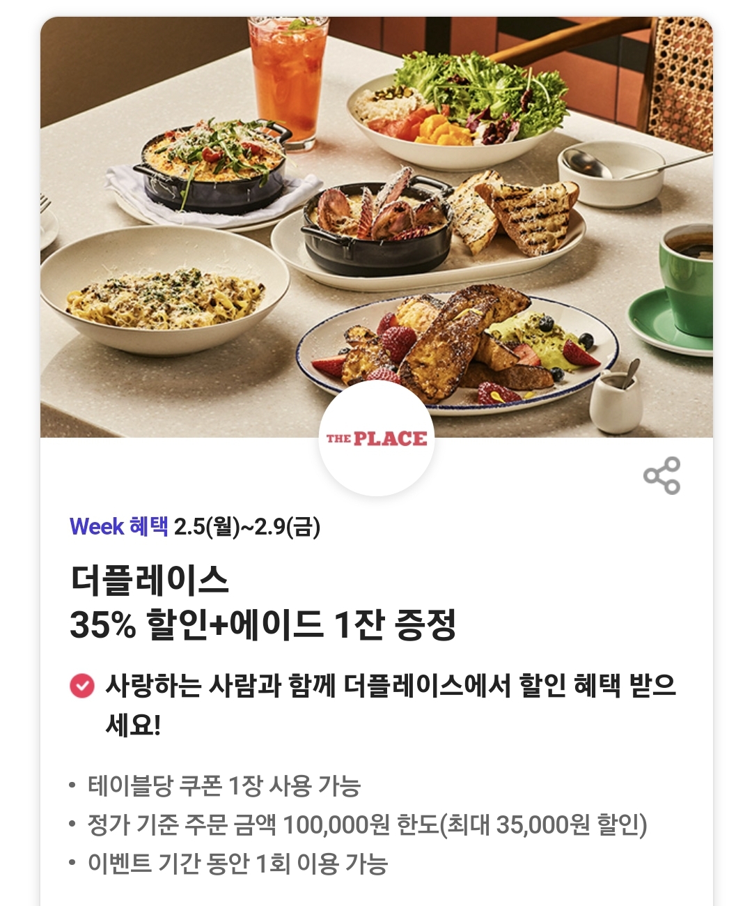 더플레이스 쿠폰 받으시면 35% 할인 + 에이드 1잔 제공됩니다